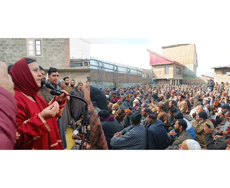 Former minister and senior NC leader, Sakina Ittoo addressing public rally at DH Pora in Kashmir on Thursday.