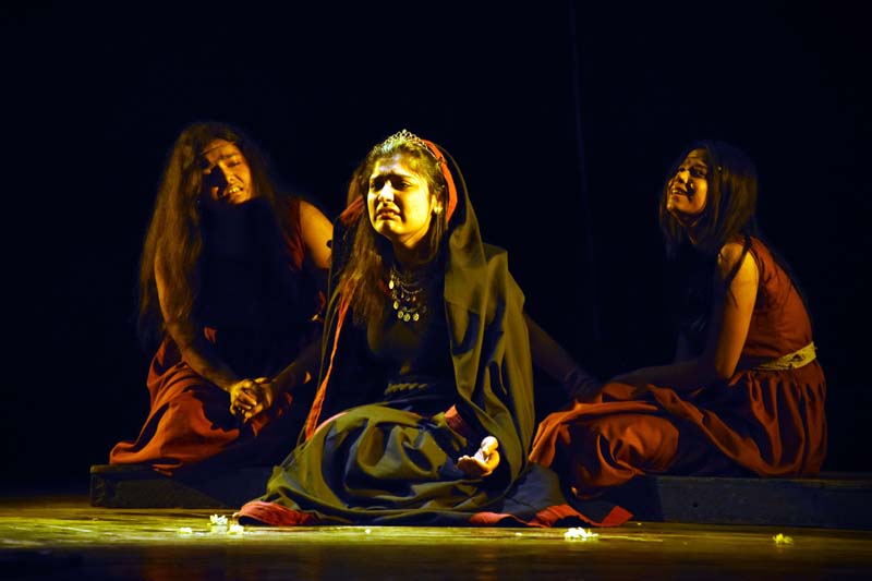 Today’s production was successfully designed to retain the play’s original context with help of thoughtful set and costumes, background musical score and light design-all of which propped up the female characters’ longish monologues that delve deeply into the nature of death, loss and its consequences. The constant high pitch speeches, shouting and wailing by female actors brought alive the feel of real-life where women continue to live with the consequences of the wars made by men.