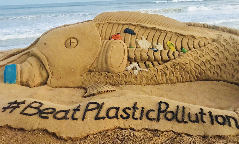 With the message “Beat Plastic Pollution,” the sand sculpture vividly illustrates the harmful effects of plastic pollution, highlighting how single-use plastics often end up polluting our oceans, rivers, and landscapes, thereby threatening both wildlife and human life.