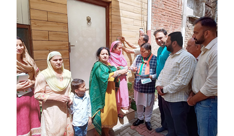 JAMMU, Apr 19: Senior BJP leader, Sat Sharma along with BJP Talab Tillo Mandal president, Keshav Chopra; ex-chairman JMC, Jeet Angral and others here today conducted door-to-door campaign for BJP candidate Jugal Kishore Sharma at Ward number 12.