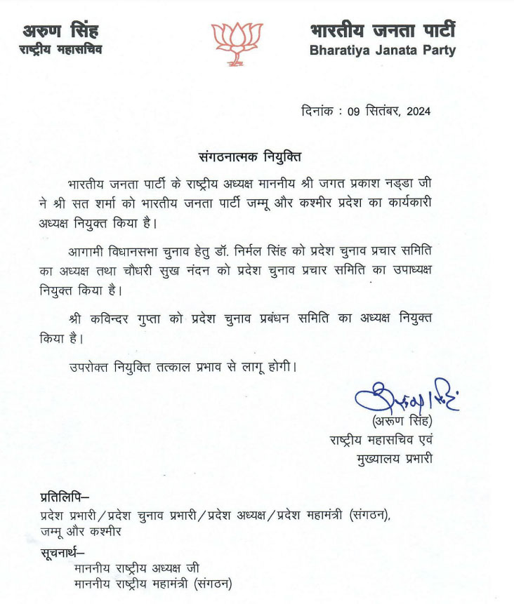 NEW DELHI, Sept 9: The BJP on Monday made some new party appointments in the poll-bound Jammu and Kashmir, naming Sat Sharma as its working president of the unit.