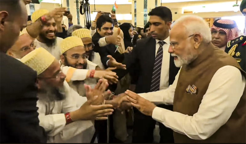 Modi joined in with claps amid loud cheers from the gathering in the hotel’s lobby.