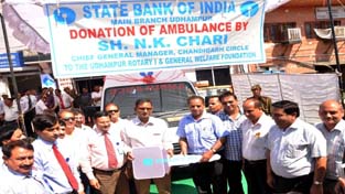 The Chief General Manager, SBI, Chandigarh Circle, N K Chari handed over the keys of Ambulance to the chairman, Rotary Eye Club, D N Sharma in the presence of A K Jain, DGM, Jammu Module and C J Tiku, RM Region III, Jammu, in a function organized at Bank’s Udhampur office.