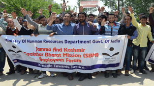 Srinagar, May 16: Jammu and Kashmir Saakshaar Baharat Mission (SBM) employees’ today staged a protest seeking immediate release of their pending wages while castigating Government for ‘lack of job policy against them’.