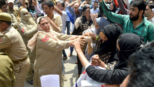 SBM employees’ protest being foiled at Srinagar on Monday. —Excelsior/Shakeel-ul-Rehman