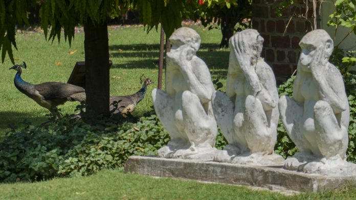 A pair of female peafowl, also known as peahen, forage at the Mahatma Gandhi Sabarmati Ashram, in Ahmedabad, Gujarat.