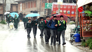 School boys holding umbrellas to avoid rain at Dangerpora in South Kashmir’s Pulwama district on Monday. —Excelsior/Younis Khaliq