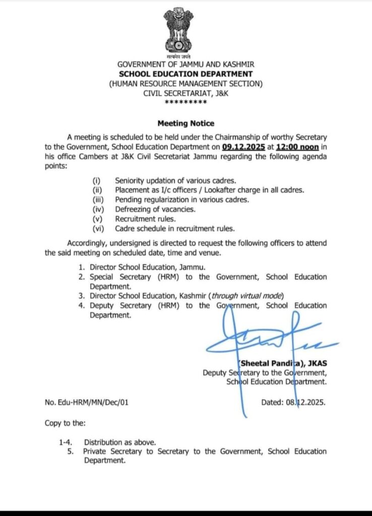JAMMU, Dec 9: The School Education Department today held an important meeting at the Civil Secretariat Jammu to review a wide range of human resource issues across its cadres.