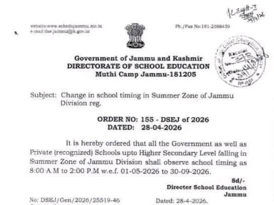 JAMMU, Apr 29: The Directorate of School Education Jammu has changed school timings for all Government and recognized private schools up to Higher Secondary level in the summer zone areas of Jammu division, with the new schedule coming into effect from May 1.