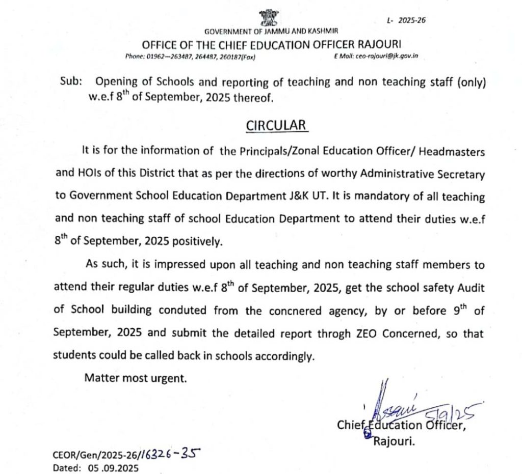 Rajouri, Sept 5: The Chief Education Officer Rajouri has directed all teaching and non-teaching staff of Government schools to resume duties from September 8, 2025.