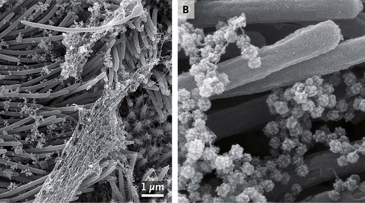The images, published in the New England Journal of Medicine, were re-colorised, and show infected hairy ciliated cells with strands of mucus attached to cilia tips.