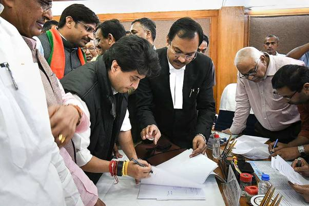 From the Madhya Pradesh BJP office, Scindia reached the state Assembly secretariat around 2 pm and submitted his papers to the returning officer, Vidhan Sabha principal secretary A P Singh.