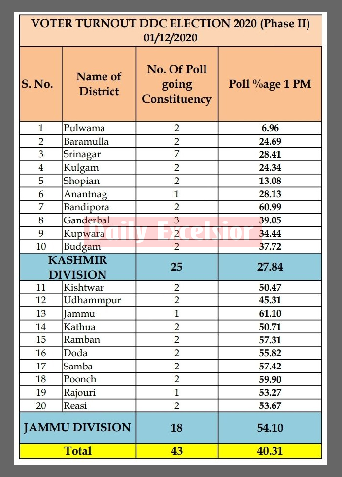More over it was informed that the Kashmir Division recorded an overall polling percentage of 27.84% while as Jammu Division recorded 54.10% upto 01:00 pm.