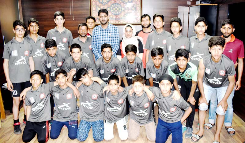 Young footballers posing along with Secretary J&K State Sports Council in Jammu before leaving for Gurgaon.