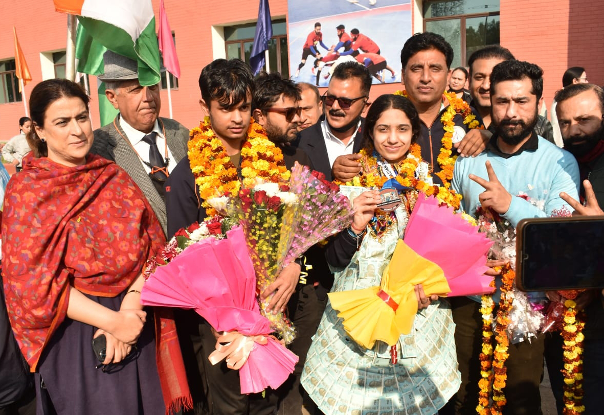 Secretary Sports Council Nuzhat Gul posing for photograph with Bronze medalists of Asian Fencing Championship at Jammu on Friday.