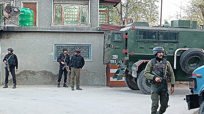 Security forces near the encounter site at Fressipora, Pulwama. Another pic on page 4. —Excelsior/Younis Khaliq