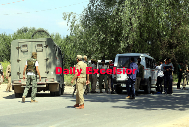 Security forces stand alert near a police van which was hit by a mysterious blast leaving a Pakistani under trial militant dead and three cops injured in Hygam area of Sopore outskirts along Srinagar-Baramulla highway in north Kashmir on Saturday ..Excelsior..Aabid Nabi