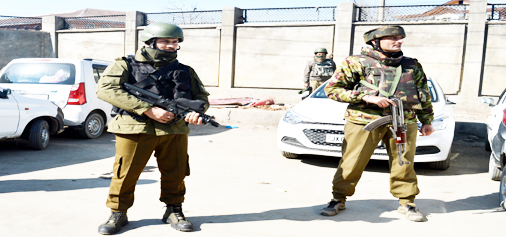 Security forces stand guard after militants opened fire at a police party inside a hospital in Srinagar on Tuesday. -Excelsior/Shakeel