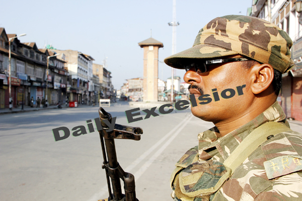 Security forces stand guard during strict curfew in Lal Chowk to foil separatist march.ExcelsiorShakeel-ul-Rehman