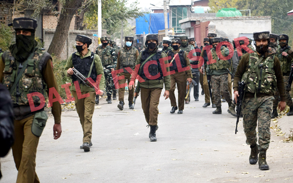 Security personnel at Rangreth in Srinagar during encounter on Sunday. — Excelsior/Shakeel