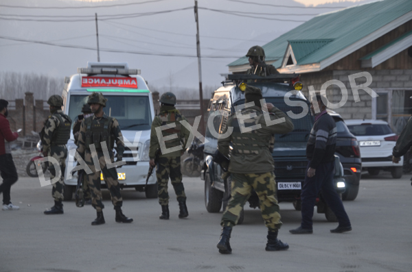 Security personnel at the site of grenade attack at Nishat Park in Bandipora on Friday. – Excelsior/Aabid Nabi