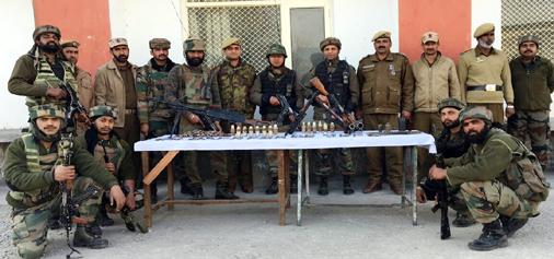 Security personnel pose with arms and ammunition recovered in Mendhar on Tuesday.