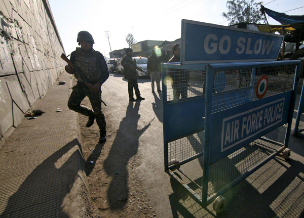 Security personnel stand guard next to a barricade outside the Indian Air Force (IAF) base at Pathankot on Saturday. (UNI) By Daily Excelsior - January 3, 2016 Share FacebookTwitterWhatsAppPinterestLinkedinCopy URLTelegramEmailTumblrReddItPrintKoo Security personnel stand guard next to a barricade outside the Indian Air Force (IAF) base at Pathankot on Saturday. (UNI) Security personnel stand guard next to a barricade outside the Indian Air Force (IAF) base at Pathankot on Saturday. (UNI) Follow our WhatsApp channel