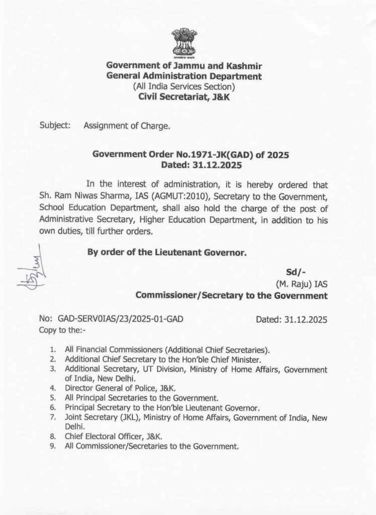 JAMMU, Dec 31: The Government of Jammu and Kashmir on Wednesday assigned additional charge of the Higher Education Department to IAS officer Ram Niwas Sharma.