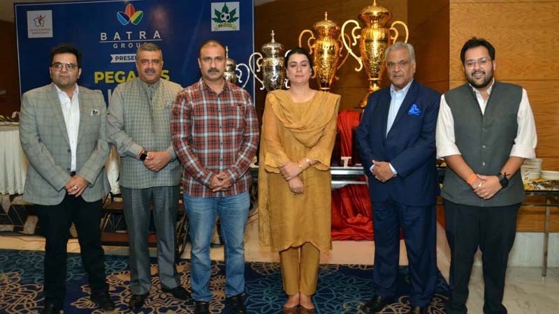 Secy Sports Council, Nuzhat Gul and Member JKSC Ranjeet Kalra during unveiling trophy ceremony of Pegasus Premier League in Jammu on Friday.