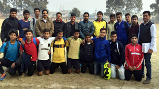 Selected players for Jammu Football Academy posing for a group photograph alongwith dignitaries and officials in Jammu.
