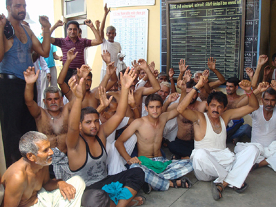 SAMBA, Sept 12: Semi-naked villagers staged strong protest demonstration against the PDD authorities and increasing interference of local NC Minister in Samba administration, outside PDD office at Vijaypur today.