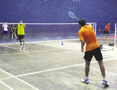 Young shuttlers in action during selection trial matches for NZ Badminton Championship at Indoor Complex, MA Stadium in Jammu. -Excelsior/Rakesh