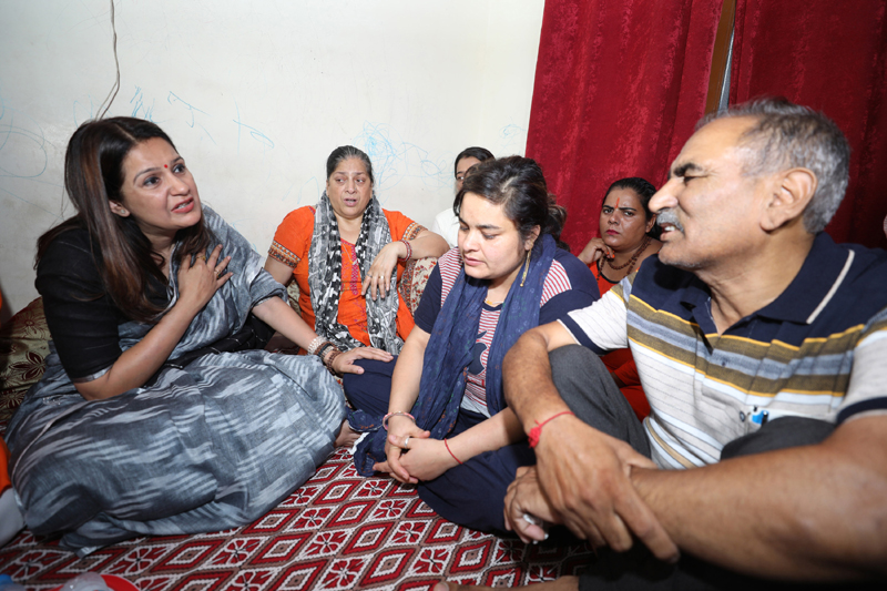 JAMMU, June 9: Strongly batting for safety and security of Kashmiri Pandits and other Hindu employees in Valley, Shiv Sena, MP Priyanka Chaturvedi today visited and met the family of Rahul Bhat at Durga Nagar and later the family of Rajni Bala a teacher at Nankey Chak Samba who were killed by militants in Kashmir last month.