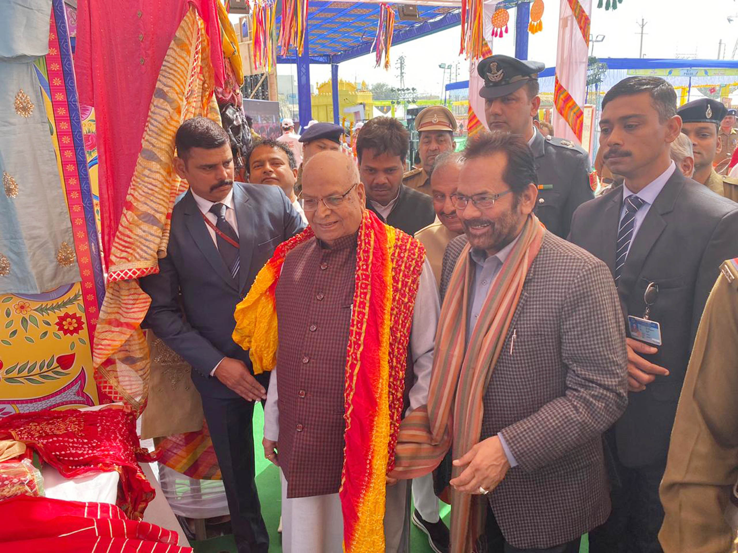 Madhya Pradesh Governor Lalji Tandon and Union Minister for Minority Affairs Mukhtar Abbas Naqvi visiting the stall after inaugurating the 'Hunar Haat' at Vijay Nagar, in Indore on Sunday. (UNI)