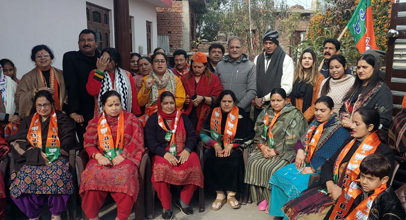 Senior BJP leader and former Deputy Chief Minister, Kavinder Gupta posing with newly joined women party workers at Beli Charana.
