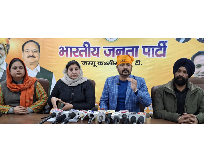 Senior BJP leader Dr Abhijeet Jasrotia addressing a press conference in Jammu on Friday.