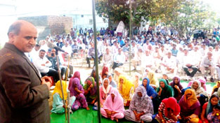 Senior Congress leader and former Deputy Chief Minister, Tara Chand addressing a public rally at Indri Manchak in Khour on Sunday.