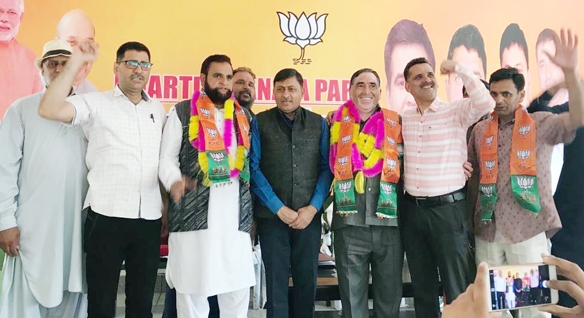 Senior Congress leader Subash Sharma and PDP leader Mohd Shabir Choudhary posing with BJP leaders after joining the party at Rajouri.