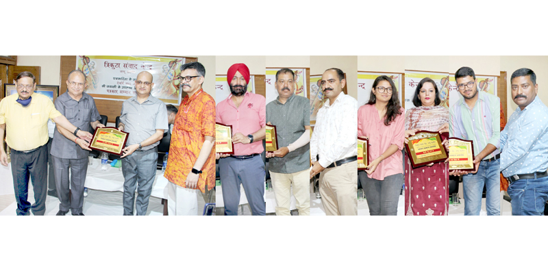 Senior Journalists Sanjeev Pargal and Pardeep Dutta among others being honoured at a function at Jammu on Sunday. -Excelsior/Rakesh