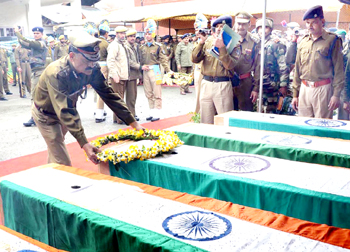 Senior officers pay homage to five CRPF personnel at police headquarter in Srinagar on Thursday.(UNI)