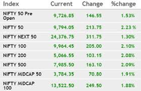 Similarly, NSE Nifty jumped 152.95 points or 1.56 per cent to 9,979.10.