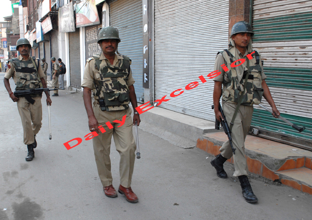 September- 21, 2013-SRINAGAR: Central Reserve Police Force Personal patrolling in Srinagar street on Saturday in the wake of shutdown called by Hurriyat G Chairman Syed Ali Shah Geelani to protest e the killing of five persons in CRPF fifing in Shopian district on September 7. Meanwhile, curfew continues to be imposed in Shopian since September 7. Photo/Mohd Amin War