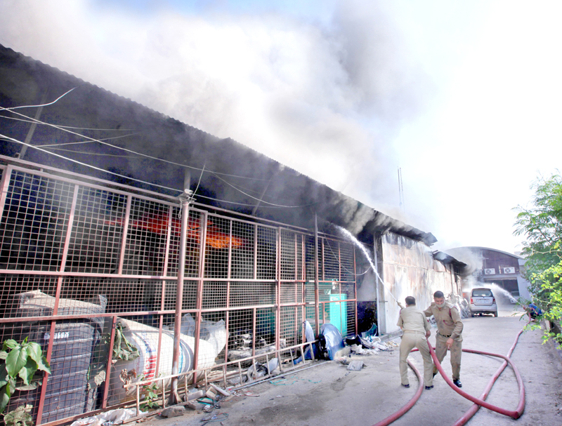 As per police sources, fire broke out at service station-cum-godown of Jammu Motors on Akhnoor road near Rajpura Chungi probably due to short circuit.