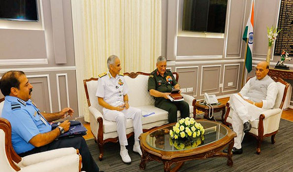 NEW DELHI: Chiefs of three services, including Indian Army General Bipin Rawat, Indian Air Force ACM RKS Bhadauria and Indian Navy Admiral Karambir Singh on Monday met Defence Minister Rajnath Singh, at the latter’s office here.
