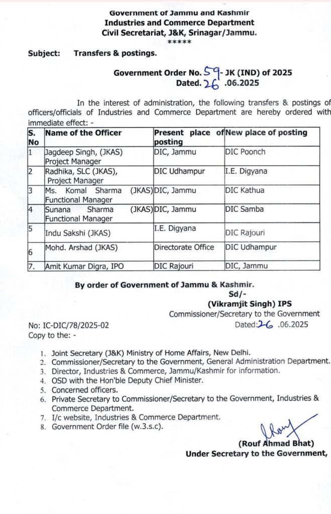 Seven I&C Deptt Officers/Officials Transferred By Daily Excelsior - June 27, 2025 Share FacebookTwitterWhatsAppPinterestLinkedinCopy URLTelegramEmailTumblrReddItPrintKoo JAMMU, Jun 27: The Jammu and Kashmir Government has ordered the transfers and postings of seven and officials of the Industries and Commerce (I&C) Department. Follow our WhatsApp channel