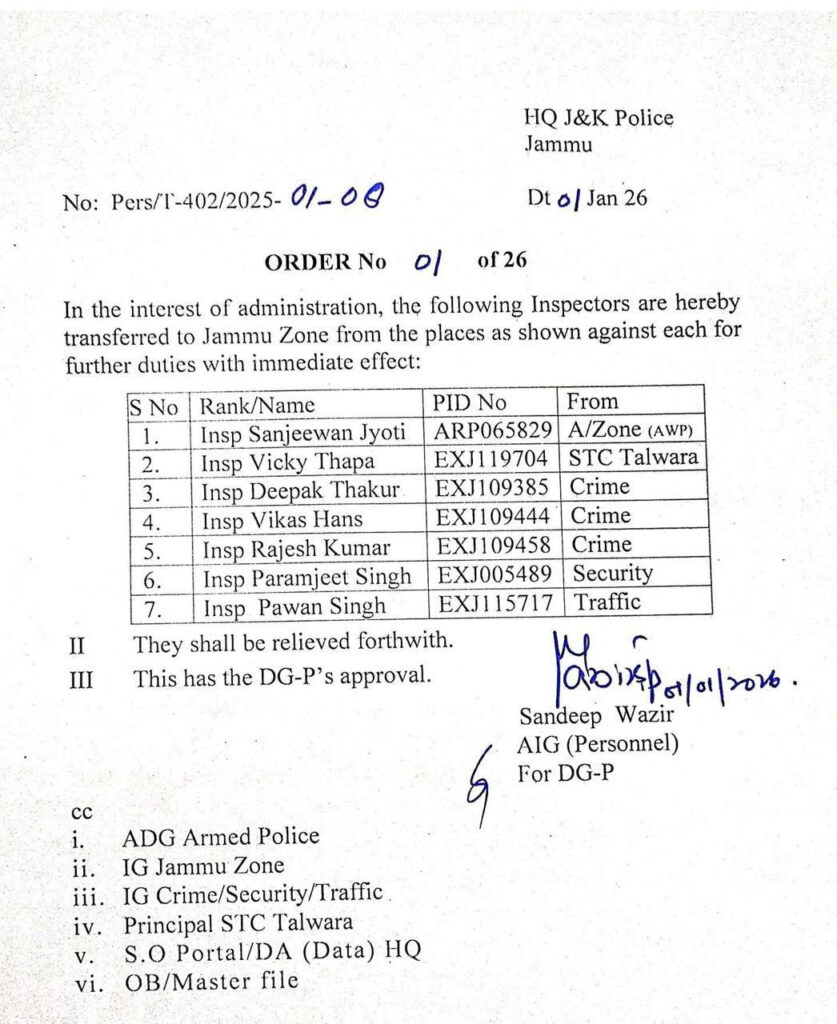 Seven Inspectors Transferred To Jammu Zone By Daily Excelsior - January 1, 2026 Share FacebookTwitterWhatsAppPinterestLinkedinCopy URLTelegramEmailTumblrReddItPrintKoo JAMMU, Jan 1: The Jammu and Kashmir Police today ordered the transfer of seven Inspectors to Jammu Zone in the interest of the administration. Follow our WhatsApp channel