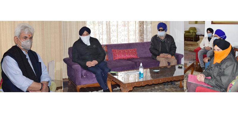 A delegation of Sikh community led by Rajinder Singh called on the Lt Governor and presented the demand of a job package for Kashmiri Sikhs on the pattern of non-migrant KPs. They also demanded the removal of encroachments around the land of Gurdwaras in the valley.