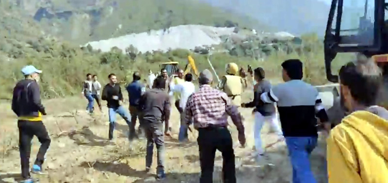 Clash taking place between protesting locals and Housing Board team accompanied by cops at Gran village in Reasi on Saturday. —Excelsior/Mengi