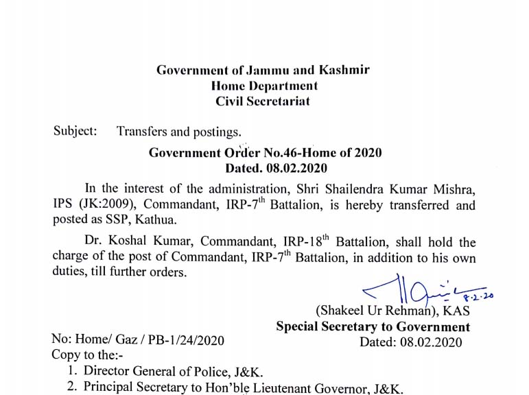Shailendra Kumar Mishra Posted As SSP Kathua By Daily Excelsior - February 8, 2020 Share FacebookTwitterWhatsAppPinterestLinkedinCopy URLTelegramEmailTumblrReddItPrintKoo Follow our WhatsApp channel