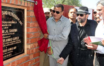 Minister for PHE Sham Lal Sharma laying foundation stone of Filtration Plant at Budgam on Wednesday.